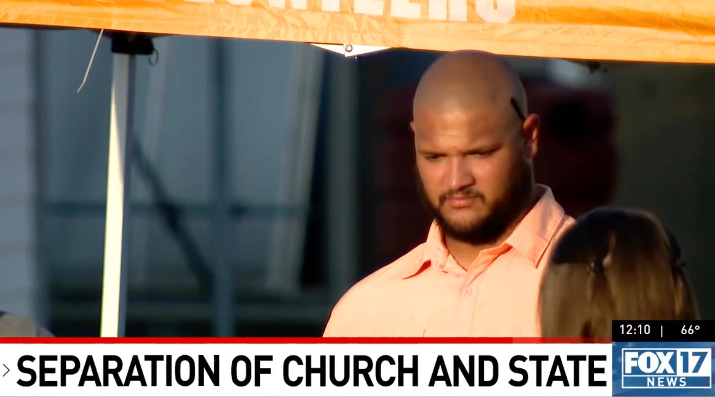 According to news reports, on Friday, September 5, Campbell spent the first half of the game “holding a Bible and leading players in prayer.” That’s after he apparently preached to kids during his day job as a resource officer at the same Clarksville school.