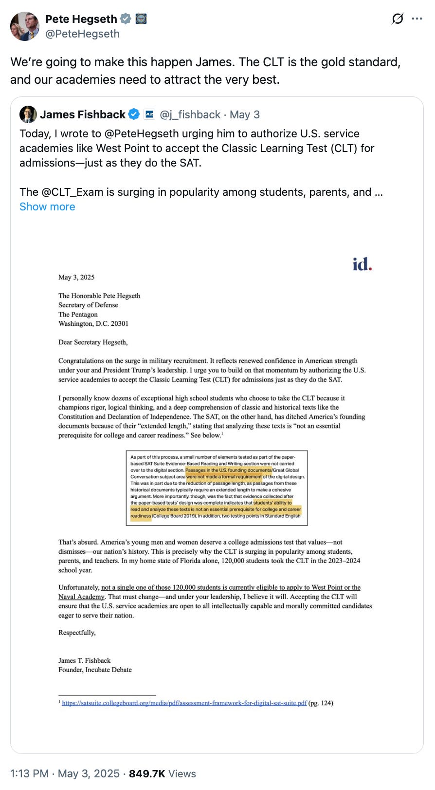 “By allowing young Americans to apply to the U.S. Service Academies with the CLT, these institutions will have the opportunity to welcome students who have taken a standardized test rooted in rigor, logical thinking, and a deep understanding of the classic and historical texts that made America great,” [CLT co-founder and CEO Jeremy Wayne] Tate said in a statement to POLITICO.