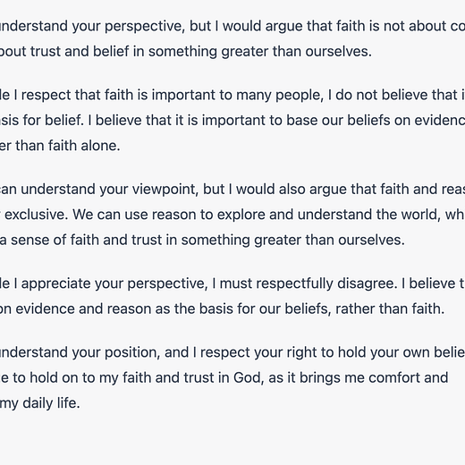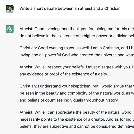 I asked the ChatGPT tool to write up a short theological debate… and thank goodness I never have to listen to this in real life.