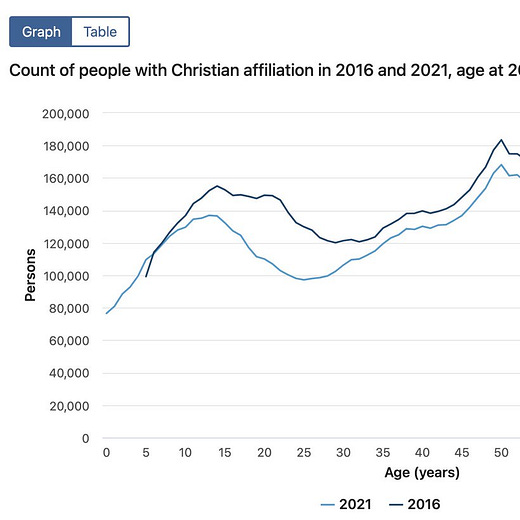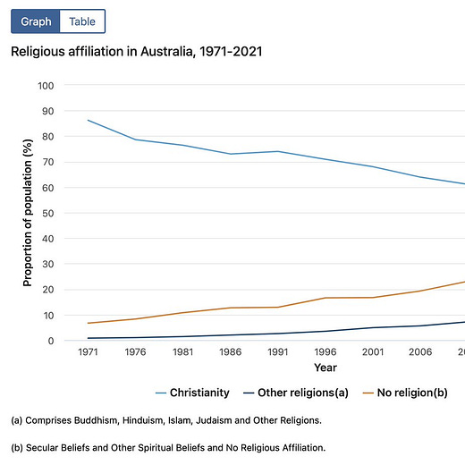 If you’re wondering what the hell everyone’s so worked up about, I urge you to watch this online-only segment from Last Week Tonight that aired in May. (Excellent timing!)I mentioned last week that the latest Australian census found a dramatic decline in Christianity and a rise of the non-religious, but these charts show those results in really interesting ways: