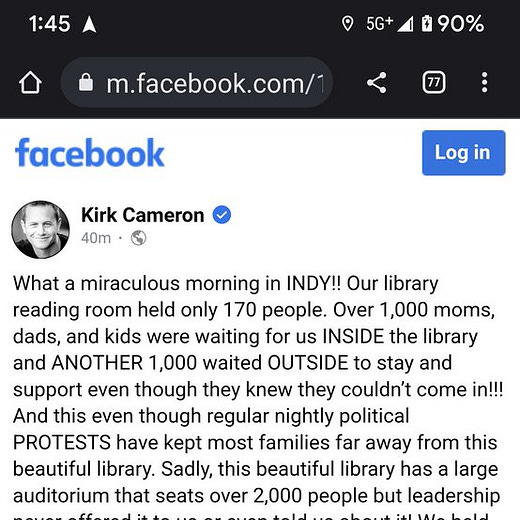 Last week, however, his team went ahead and rented space from the Indianapolis Public Library to host their own event. Cameron’s publisher Brave Books put the attendance number at “over 2,500” while FOX said it was “the biggest crowd the library had seen in 137 years.”