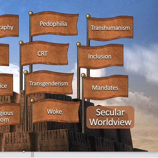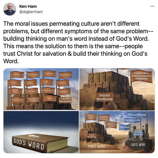 Creationist Ken Ham uses one particular slide in most of his presentation depicting all the societal ills that Christians need to fight against. A new version of the slide includes other “moral” concerns like… “Woke,” “Mandates,” and “Inclusion.”