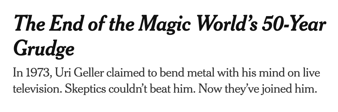 Why is the Times trying to salvage the reputation of a man who has spent his life spreading lies? (Didn’t they learn anything from the Elizabeth Holmes controversy?) Society isn’t better off because men like Geller convince people telekinesis is real. And if he actually did have those powers, what does it say about Geller that he’s spent his entire career performing the most mundane party tricks rather than helping others?